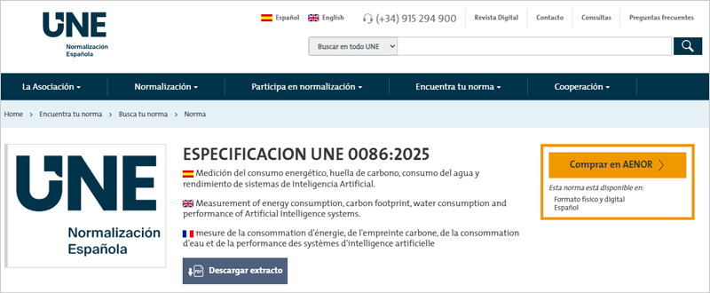 La especificación UNE 0086:2025 establece cómo medir el consumo energético, la huella de carbono, el consumo de agua y el rendimiento de los sistemas de IA. Para ello, proporciona una guía detallada para cuantificar el impacto ambiental de modelos y algoritmos de IA a lo largo de todas las fases de su ciclo de vida, especialmente durante el entrenamiento y la implementación, tanto en entornos locales como en la nube. Se centra de forma particular en los modelos de IA generativa y grandes modelos de lenguaje (LLMs), dada su elevada carga computacional y su consecuente impacto ambiental.