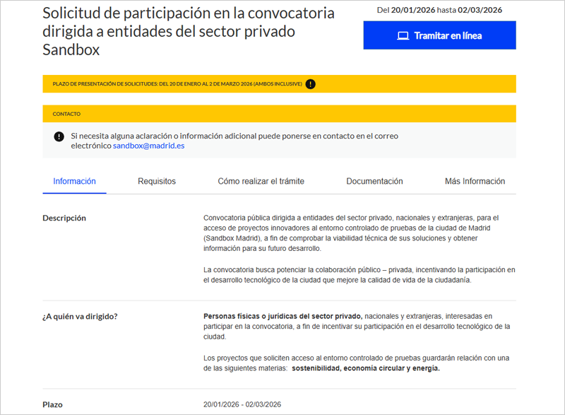 El Ayuntamiento de Madrid ha abierto el plazo de solicitud de participación en la convocatoria pública Sandbox Madrid, dirigida a entidades del sector privado, tanto nacionales como extranjeras, interesadas en acceder al entorno controlado de pruebas de la ciudad para el desarrollo de proyectos innovadores. El plazo de presentación de solicitudes está abierto hasta el 2 de marzo de 2026.