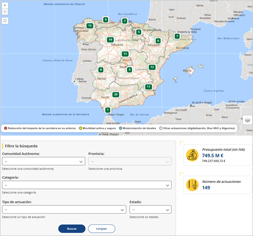 El Ministerio de Transportes y Movilidad Sostenible destinará hasta 325 millones de euros (IVA incluido) a la modernización de 98 túneles de la Red de Carreteras del Estado. Las mejoras incluyen actuaciones en iluminación, ventilación, señalización e instalaciones, con el fin de adecuar estas infraestructuras a los niveles de seguridad y confort establecidos por la normativa vigente. Actualmente, se ejecutan 23 contratos en La Coruña, Pontevedra, Alicante, Almería, Asturias, Barcelona, Burgos, Cantabria, Granada, Jaén, Lugo, Madrid, Málaga y Valencia.