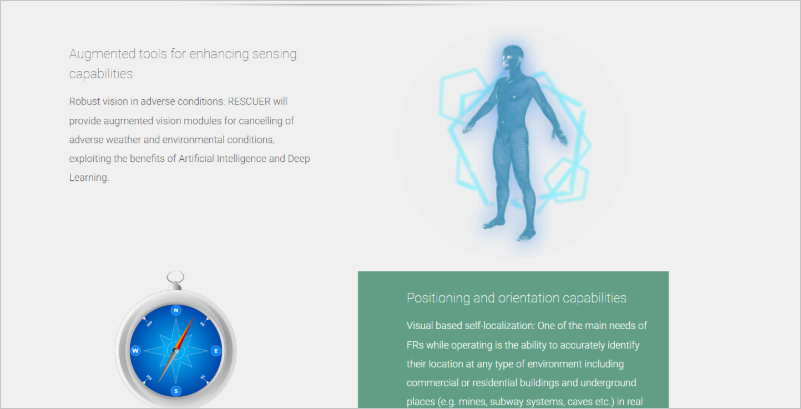 Entre sus innovaciones destacan módulos de visión aumentada capaces de operar en condiciones climáticas y ambientales adversas, utilizando inteligencia artificial y aprendizaje profundo para mejorar la visibilidad y la identificación de riesgos. Además, incorpora sistemas avanzados de posicionamiento y orientación basados en autolocalización visual, que permiten a los primeros intervinientes determinar con precisión su ubicación en tiempo real, incluso en entornos interiores o subterráneos como edificios comerciales, minas o redes de metro.