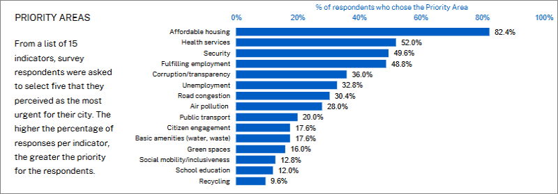 El estudio incorpora su evaluación dentro de los dos pilares del índice, estructuras y tecnología, que permiten medir tanto la calidad de los servicios urbanos como la disponibilidad de soluciones digitales en la ciudad. Entre las áreas consideradas prioritarias por los ciudadanos destacan la vivienda asequible, señalada por el (77%), seguida de la seguridad (45%) y los servicios de salud (56%).