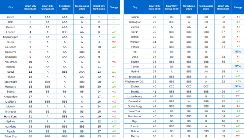 El Smart City Index 2026, elaborado por el IMD World Competitiveness Center, analiza 148 ciudades de todo el mundo a partir de la percepción de sus residentes y de indicadores estructurales. El informe mide el desempeño urbano en ámbitos como movilidad, vivienda, salud, seguridad y gobernanza digital, combinando datos sobre infraestructuras con encuestas ciudadanas. En la clasificación global, Zúrich lidera el ranking este año, seguida de Oslo y Ginebra, destacando por su equilibrio entre infraestructuras, digitalización y calidad de vida. En este contexto internacional, las ciudades españolas Bilbao (puesto 30), Madrid (37), Zaragoza (63) y Barcelona (94) también aparecen en el índice, con posiciones que reflejan distintos niveles de desempeño dentro del mapa mundial de ciudades inteligentes.