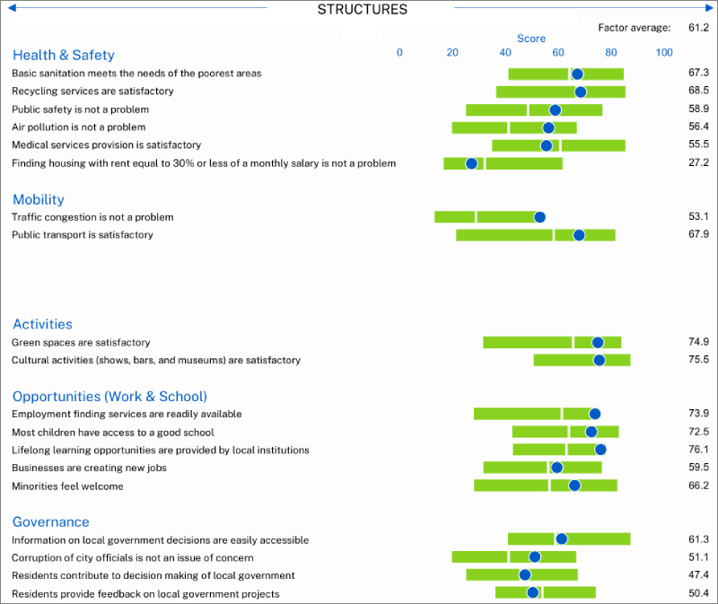 Su posición refleja un rendimiento distribuido en el conjunto de indicadores evaluados por el índice, que combina la percepción de los residentes con el análisis de infraestructuras y servicios urbanos.