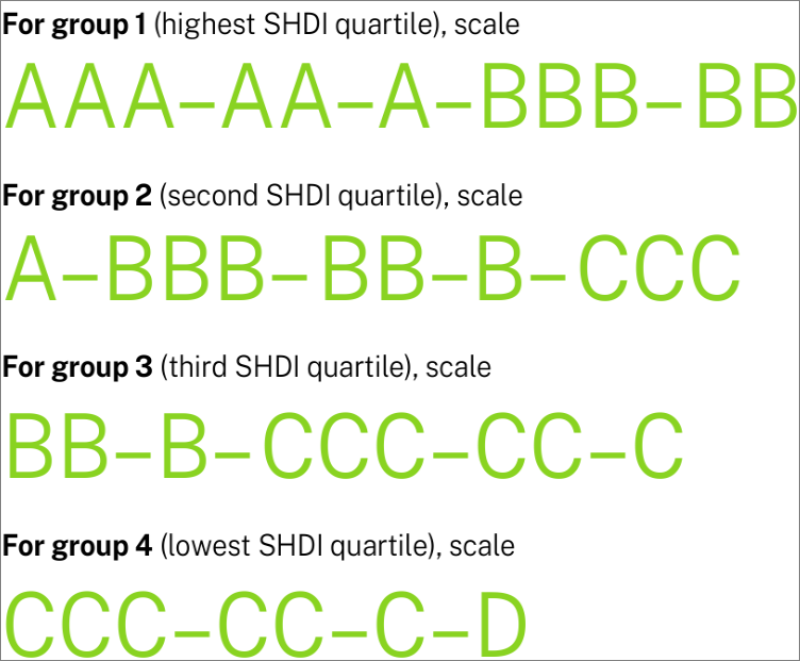 Las ciudades se agrupan en cuatro categorías basadas en el Índice de Desarrollo Humano Subnacional (SHDI) elaborado por Global Data Lab. Dentro de cada grupo, las ciudades reciben una calificación cualitativa de AAA a D, en función de su puntuación de percepción en comparación con el resto de ciudades del mismo nivel de desarrollo.