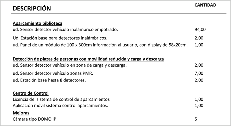 El proyecto consiste en el suministro, instalación y puesta en marcha de los sistemas y tecnologías necesarios para la gestión y operación de estacionamiento en la vía pública, con capacidad de adaptación tanto a las necesidades actuales como futuras, capaz de gestionar distinto tipos de plazas de estacionamiento catalogadas en función de su uso: Carga y descarga, PMRs, detección plazas no autorizadas, guiado a plazas libres y control de plazas de aparcamiento entre otras. Esta actuación se centra en la gestión y control del estacionamiento de vehículos en plazas reservadas a personas con movilidad reducida en la calle Azorín y en la zona de aparcamiento ubicada en la calle Reverendo Padre José Palacios, el tramo comprendido entre la calle Roll de les Eres y la calle Marques del Turia. La gestión y control del estacionamiento de vehículos en plazas reservadas para carga y descarga en la calle Azorín y en la zona de aparcamiento ubicada en la calle Reverendo Padre José Palacios, el tramo comprendido entre la calle Roll de les Eres y la calle Marques del Turia. La gestión y control del estacionamiento de vehículos en la zona de aparcamiento ubicada junto a la biblioteca en la calle Marqués del Turia. En esta actuación quedarán gestionadas y controladas 7 plazas reservadas a personas con movilidad reducida, 2 zonas de carga y descarga disponiendo en cada zona dos plazas de estacionamiento de vehículos y 94 plazas de estacionamiento de vehículos.