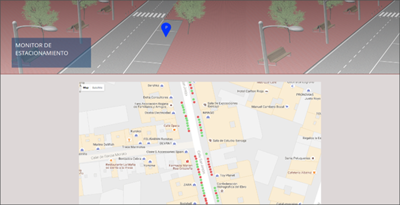 El software de control mediante la integración de los servicios ofrecidos por Google Maps, permite la geolocalización de los sensores. Esta información de geolocalización combinada con la información aportada por el estado de los sensores, es la que el software de control utiliza para obtener la información del estado de las plazas y poder indicar al usuario, por un lado cual es el nivel actual de ocupación, el número de plazas libres que existan en ese momento y gracias a los servicios de geolocalización se indica al usuario la localización exacta de dichas plazas, pudiendo iniciar la utilidades de navegación de google Maps para indicar al usuario la ruta a seguir hasta la plaza de aparcamiento.